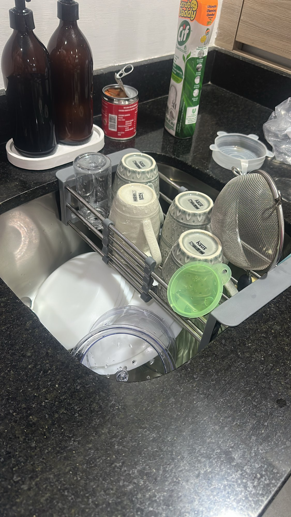 sto utilizzando lo scolapiatti da un po’ ed è eccellente, pulito anche con anticalcare e resta lucido e non c’è ruggine. Il mio lavello ha un bordo leggermente tondo quindi non si adatta nell’ angolo e poiché il lavello ha un doppio bordo ho dovuto utilizzare 2 fascette in plastica per tenerlo in posizione. Le posate scivolano attraverso le griglie ma non è un problema. La misura ridotta permette di avere metà lavello libero per fare altro. Semplicemente perfetto.