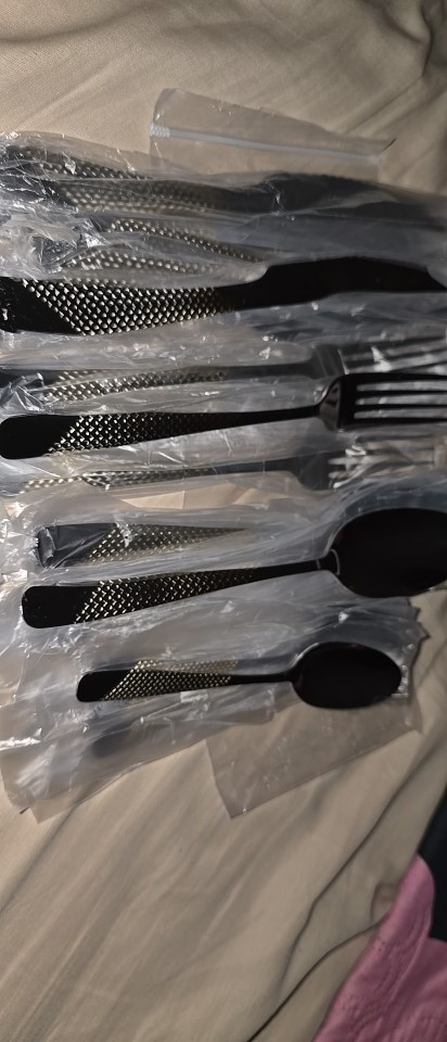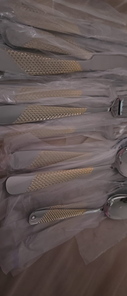 Los cubiertos vienen bien, están pesados y se ven de buen material. Esperando le duren mucho las partes doradas, le dan un toque fino.